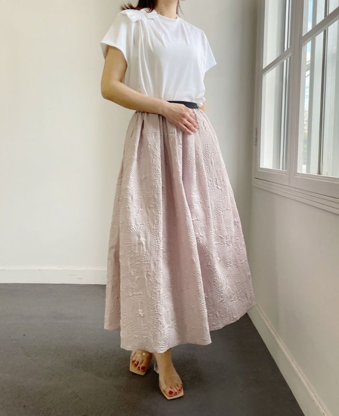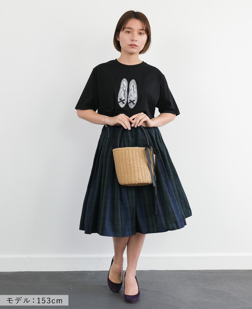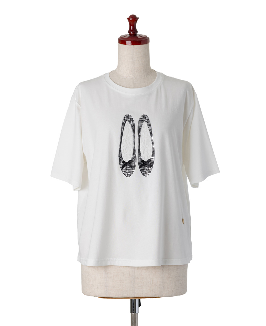 リラクシーなサイズ感にバレエシューズのモチーフが目を惹くTシャツ。長めの袖丈が自然と気になる所もカバー。日常に使いやすい大人可愛いデザイン。神戸・山の手スカートと合わせれば、きちんと感もある上品カジュアルな装いに。