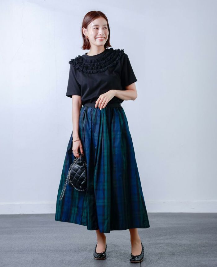 おすすめポイント:バレエシューズのモチーフとタータンチェックのエレガントでクラシカルな雰囲気はシーン問わず使える!もっとカジュアルに着用する際は、足元をスニーカーに変更すると長時間疲れず歩き回れます。