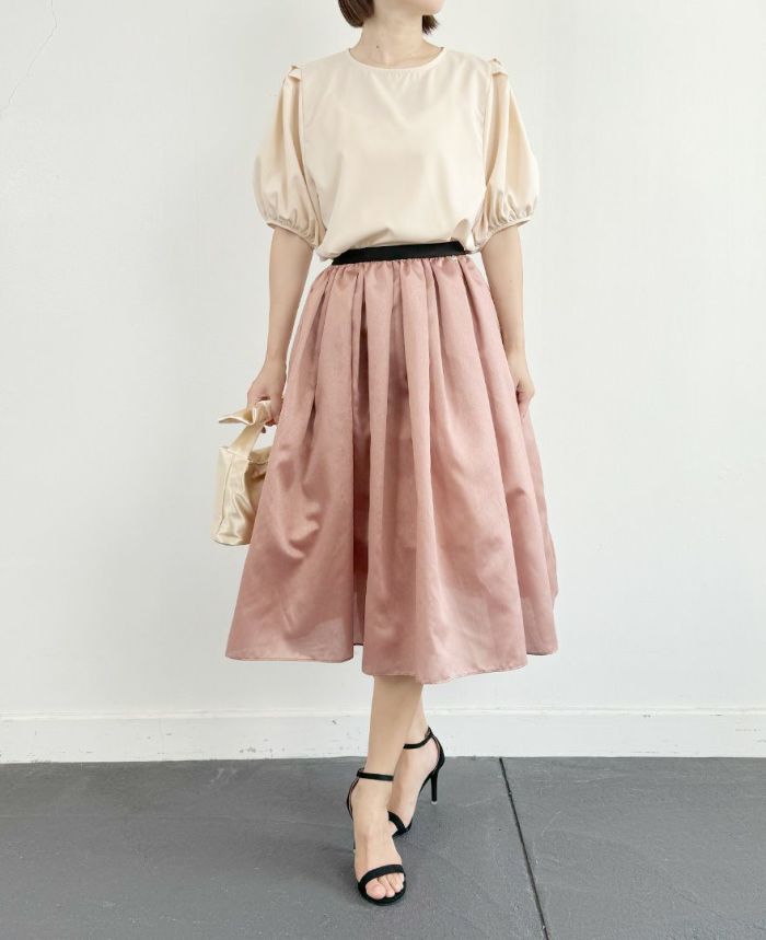 バルーン袖Tシャツ(ベージュ)×神戸・山の手スカート(トレコードピンク)