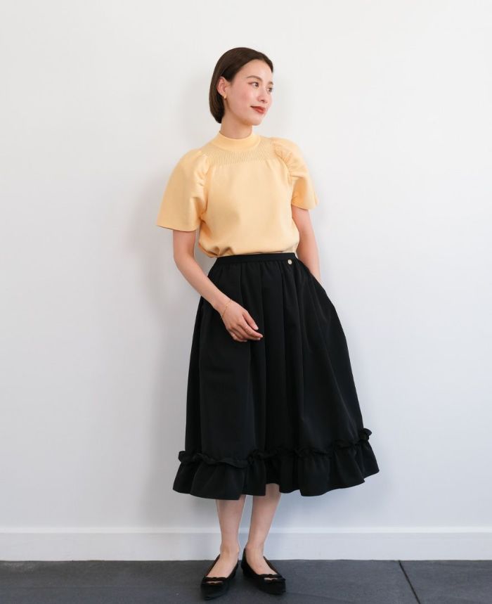 パフスリーブニット(メローイエロー)×神戸・山の手裾フリルスカート(ブラック)