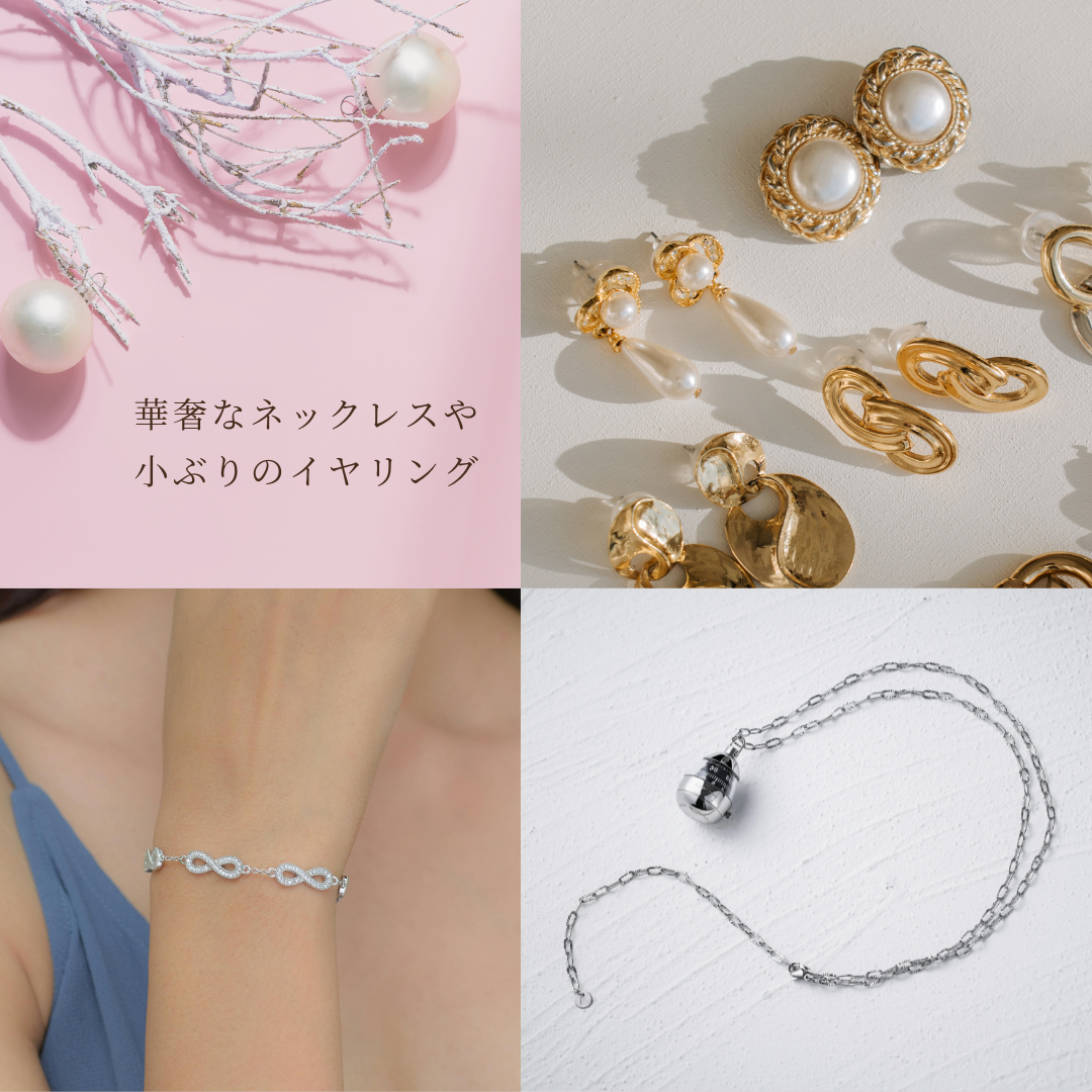 首元には華奢なパールのネックレスで上品さをプラス。デコラティブなトップスは、アクセサリーなしでも着映えが叶うので、なくてもOK!