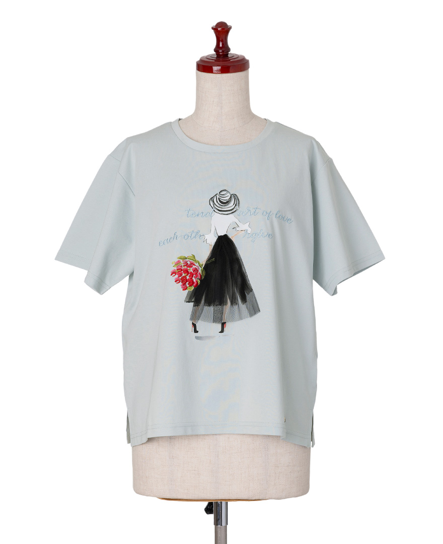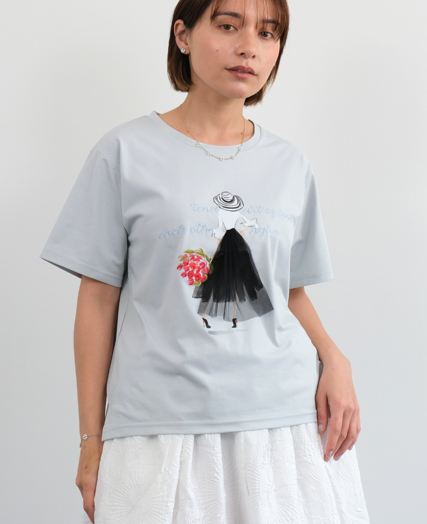 トレンドライクなプリントTシャツ。手描きタッチなパリジェンヌモチーフは上品華やか!カジュアルなTシャツも上品な印象に。