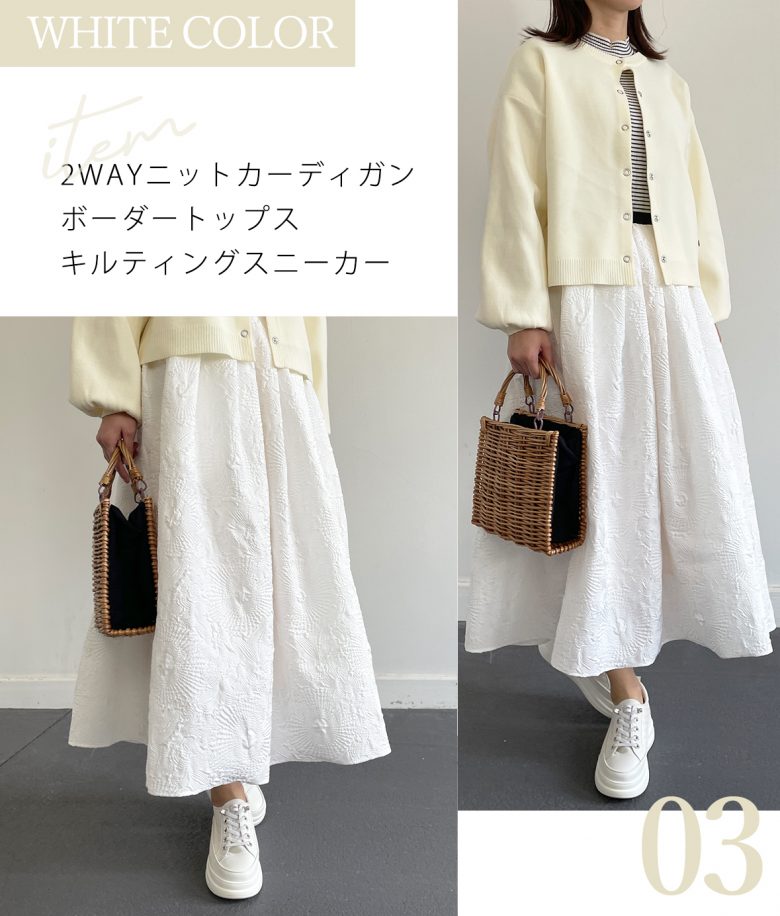 清潔感のある、ホワイトはどんなカラーにも合う万能色です。アイボリーやブルーを合わせると一気に春らしさアップ!