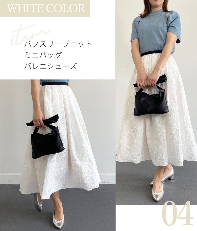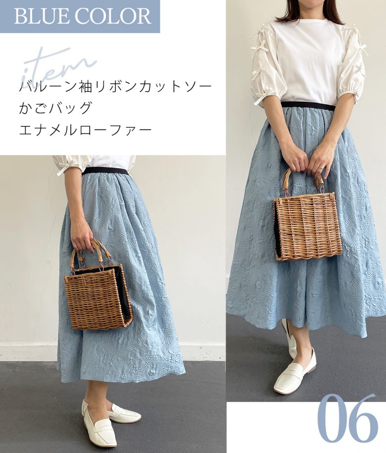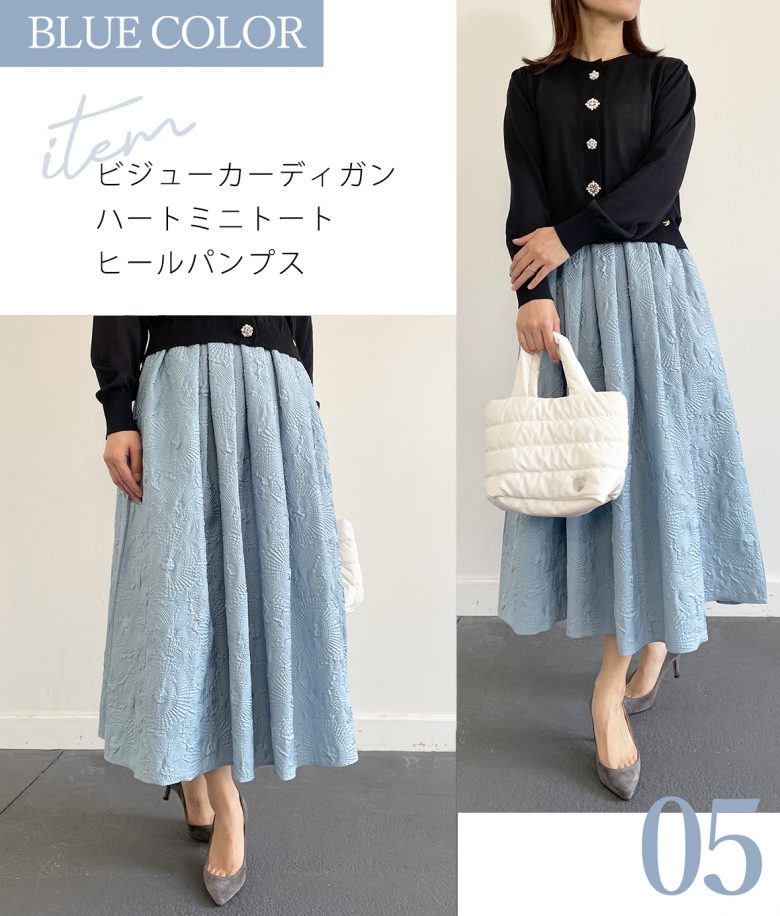涼し気で爽やかなブルーには、ホワイトやブラックカラーを合わせるとスカートの色が美しく際立ちおススメです。