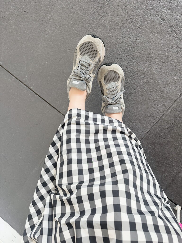 神戸・山の手スカートにスニーカーを合わせたラクちんコーデ。