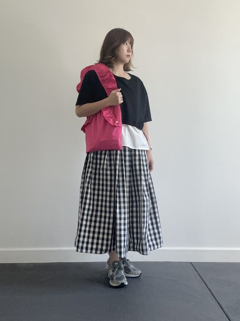カジュアルなスニーカーを合わせるときは、フリルやチェック柄などの女性らしさを感じるデザインアイテムをチョイス!