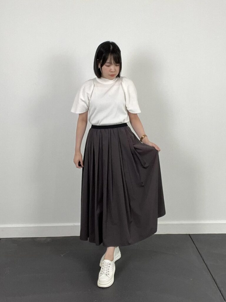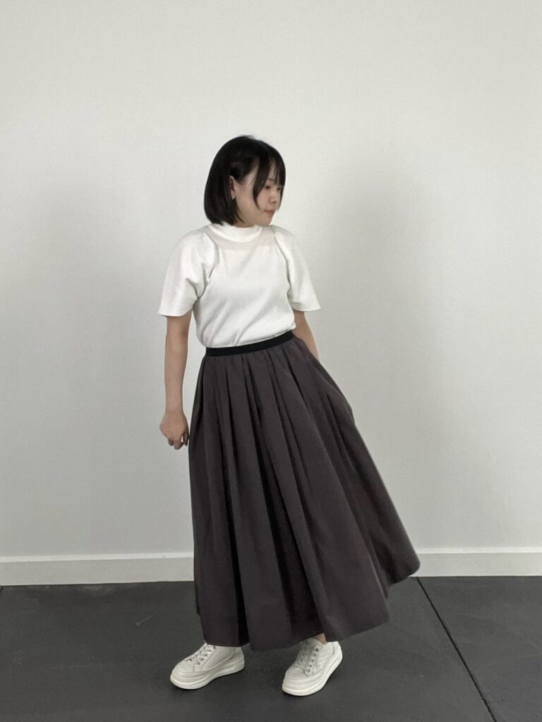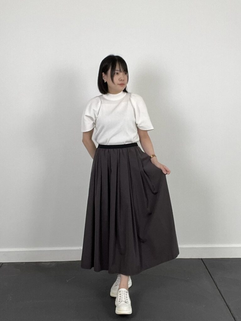 トップス・スカート・スニーカーのトーンを合わせたワントーンコーデ。