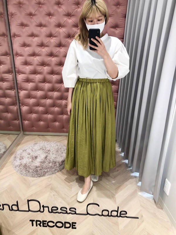 最後はホワイトのブラウス(7/31より取り扱い開始)に、最初のコーデにも使用したシフォンギャザーマキシスカートのグリーンを合わせたコーデ。