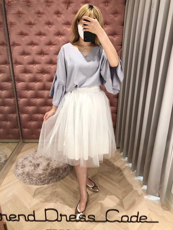トップスはゆるっと着られるブルーのシャーリングスリーブVネックブラウスに、今お店でもオンラインショップでも大人気の神戸・山の手リバーシブルチュールスカート ロング丈を合わせてみました。