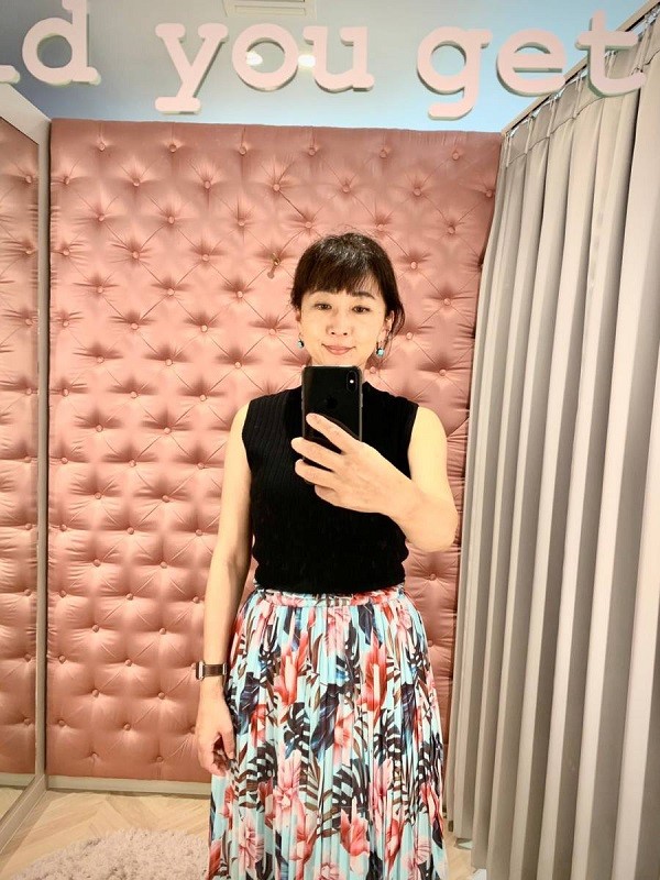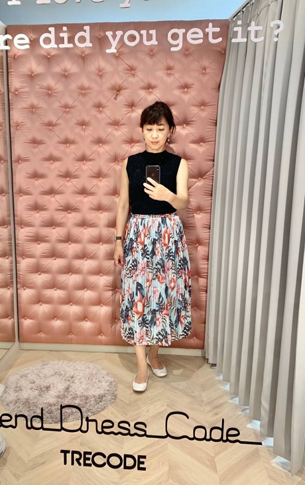 ノースリーブニットと花柄のプリーツスカートをコーデしたかのように見えるドッキングタイプ。