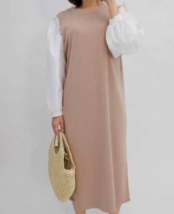 ボリューミーな布帛スリーブとらくちんカットソーノースリーブワンピがドッキング。