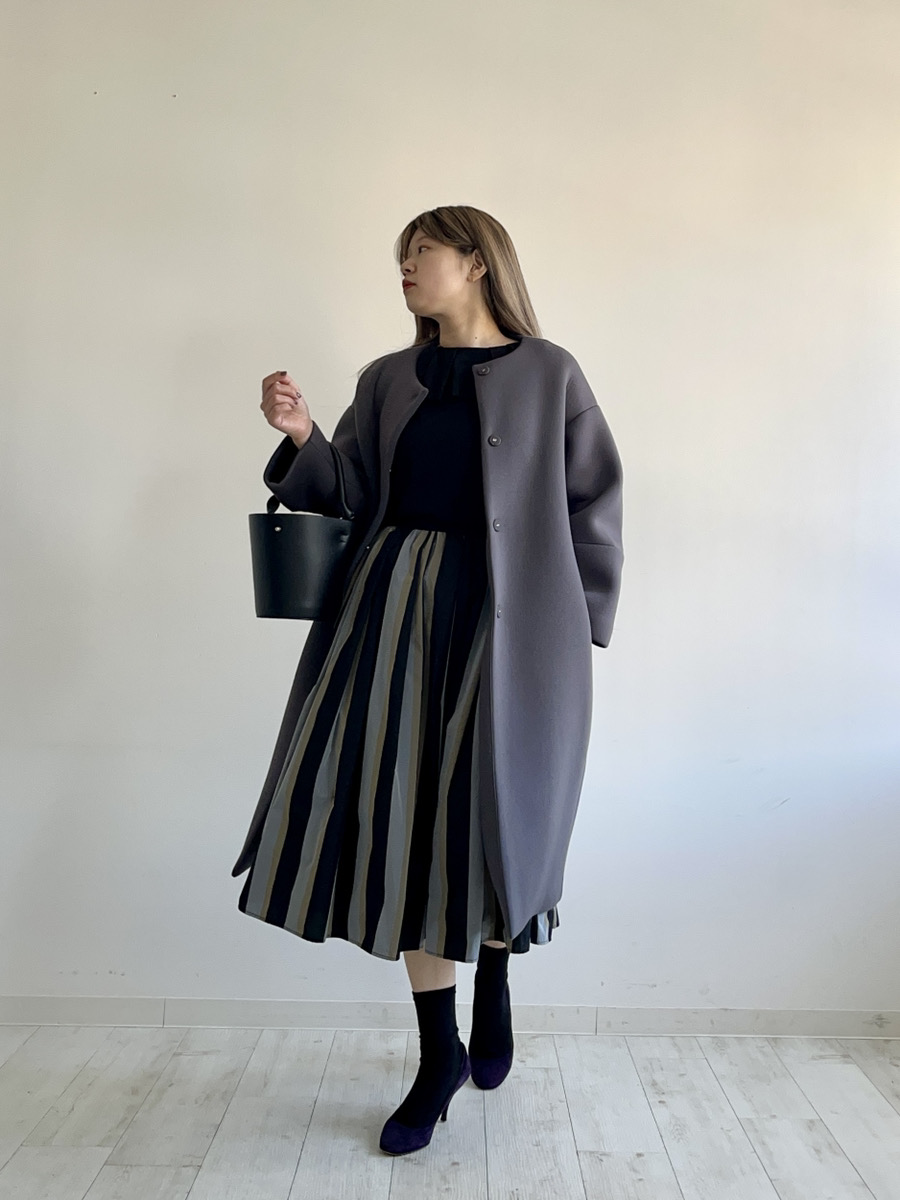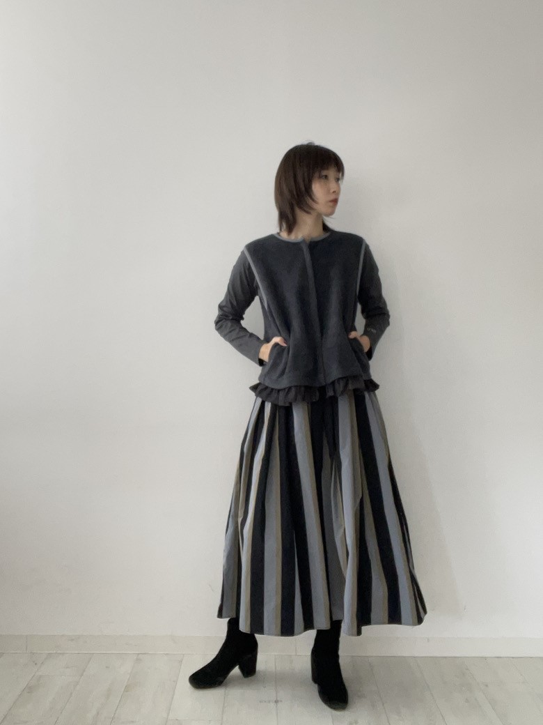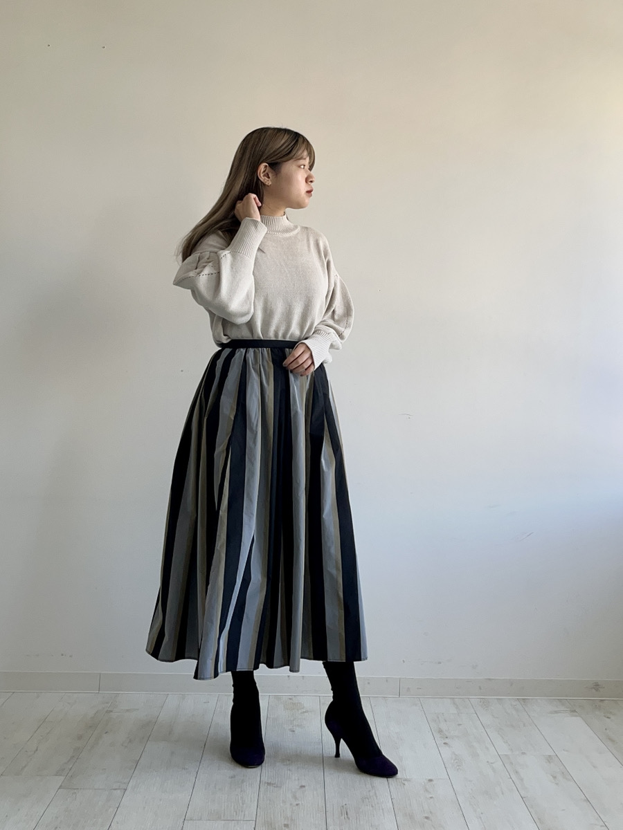 新鮮なデザインの「神戸・山の手ストライプスカート」のコーディネートをスタッフの身長別にご紹介致しました。