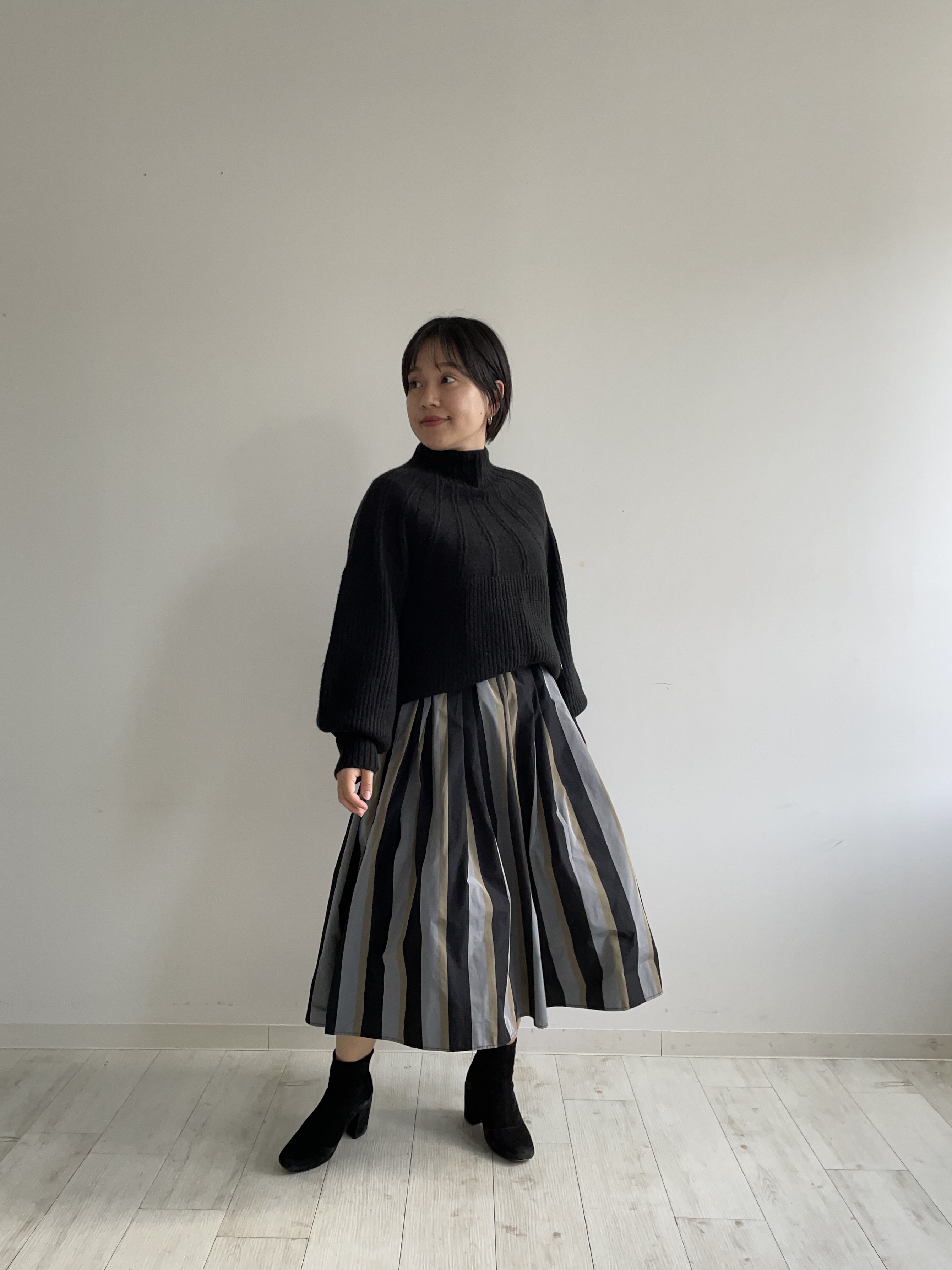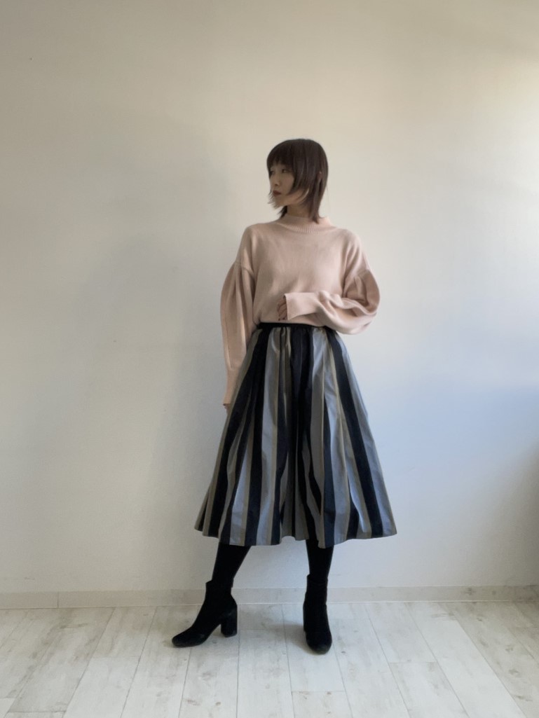 女性の可愛らしさが出るミモレ丈には、ボリューム感のあるニットとブーツを合わせてお出かけスタイルにコーディネート。