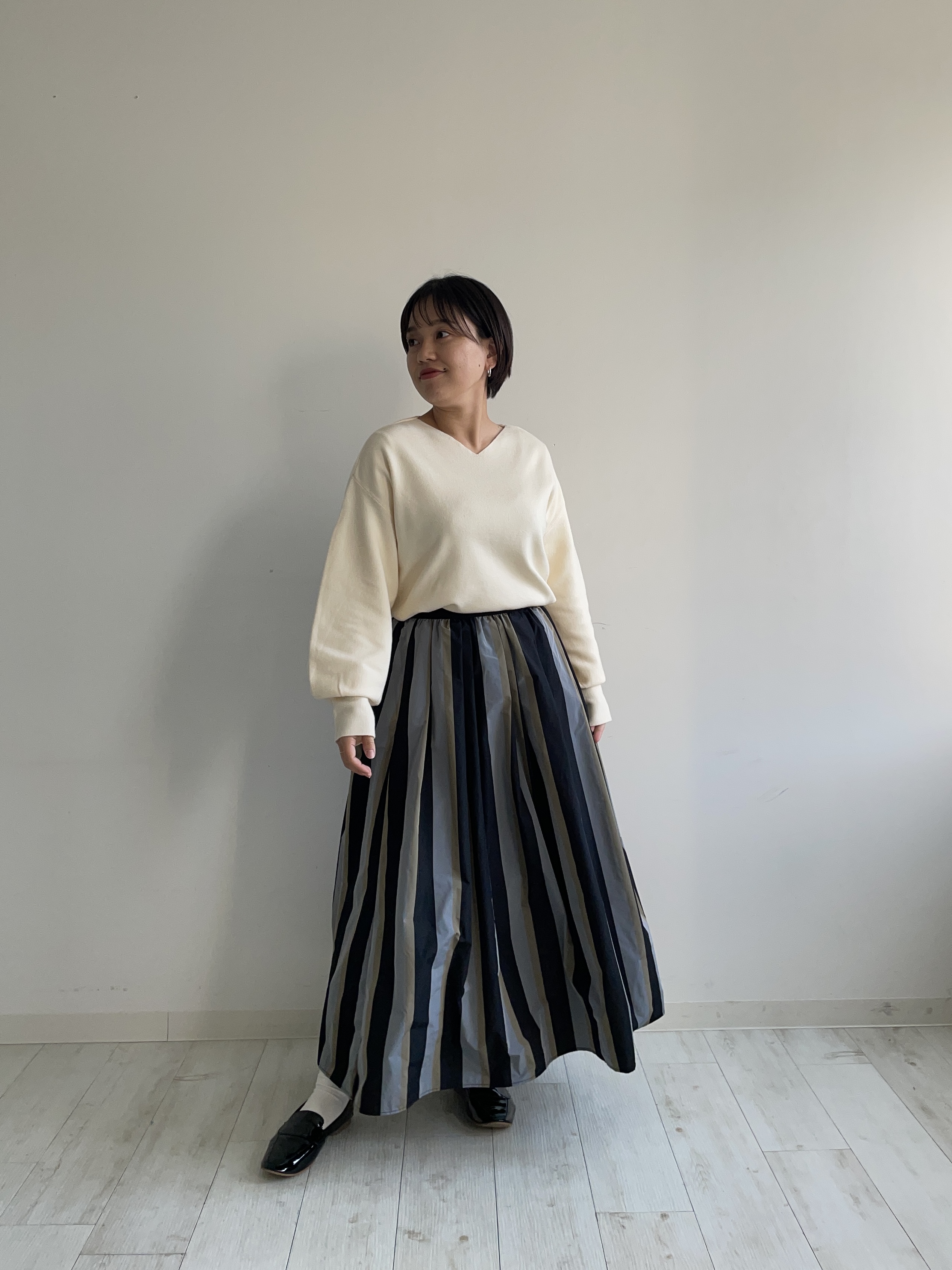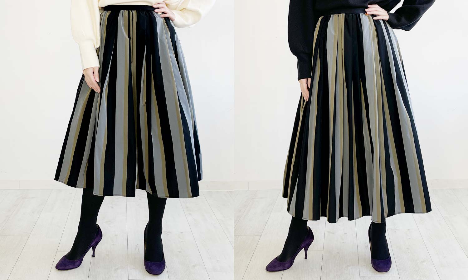 ふんわりシルエットのフレアスカートもストライプ柄ですらっとしたシルエットにスタイルアップ!