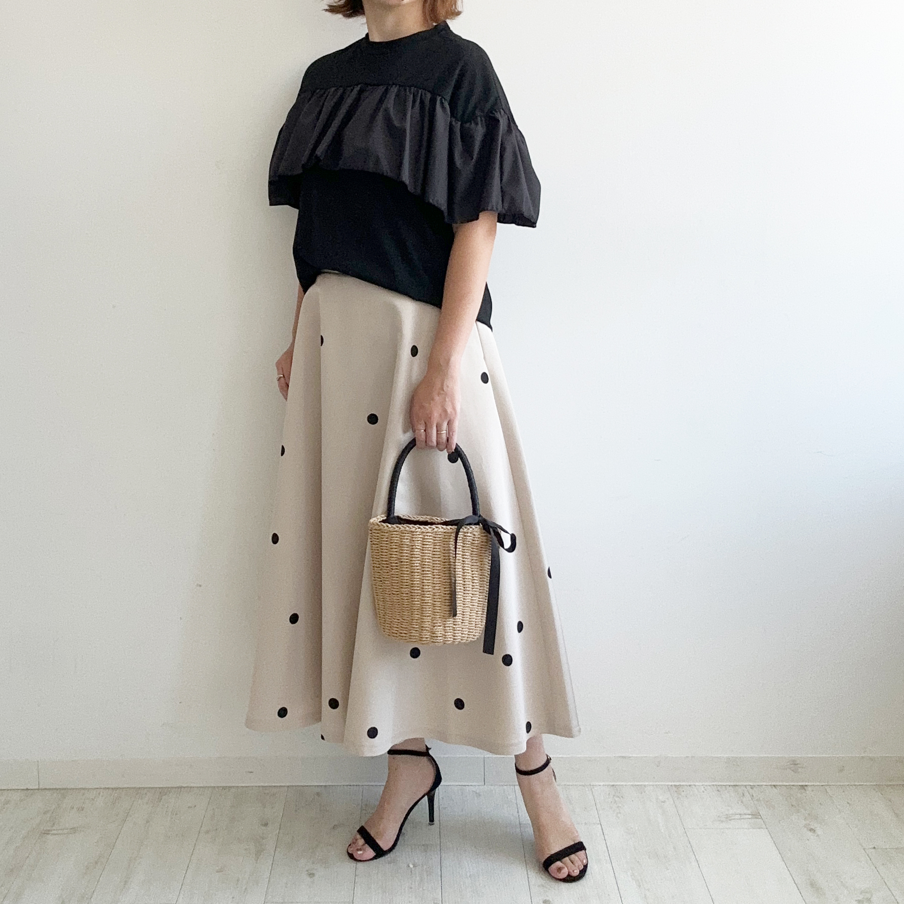 スカートは、ピンドットスカートを合わせて、動く度にふんわりとしたシルエットでこなれ感も抜群。
