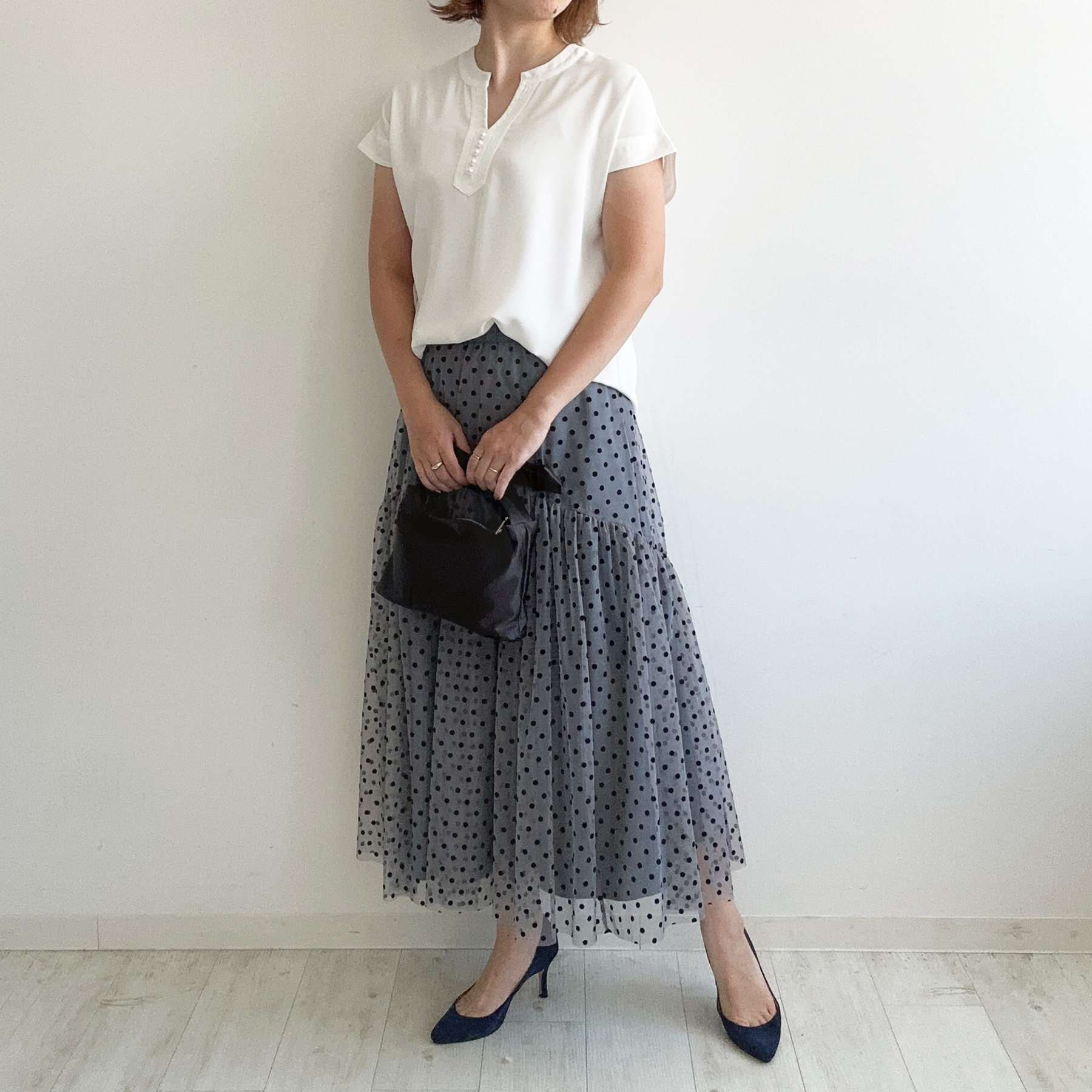 スカートは、ウエストゴムでラクチンなドットチュールスカートを合わせてほんのりと甘さをプラス。