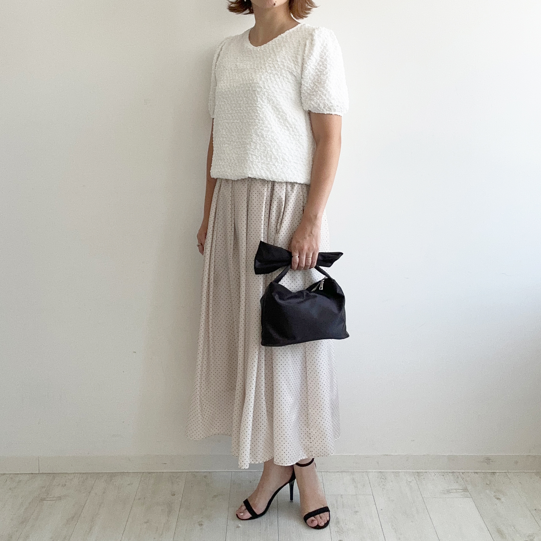 体型カバーもしっかりと叶えられる、夏の大人フェミニンスタイルの完成。