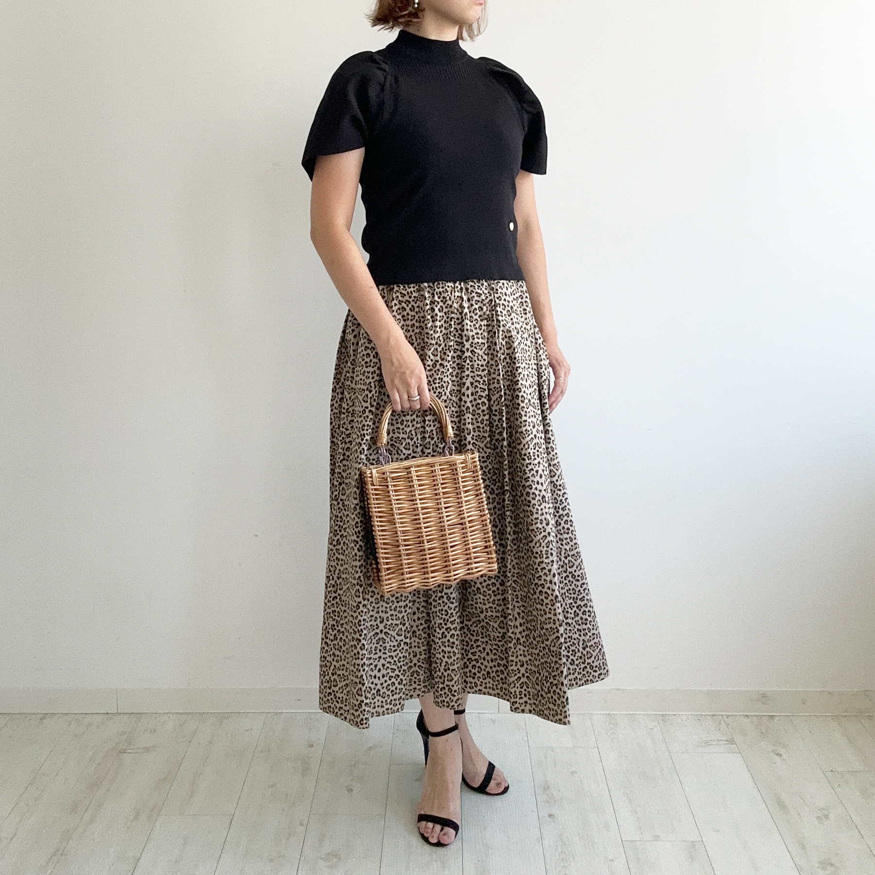 スパイシーなレオパード柄ロングスカートには、着痩せ効果抜群のパフスリーブニットを合わせて大人顔スタイルの完成。