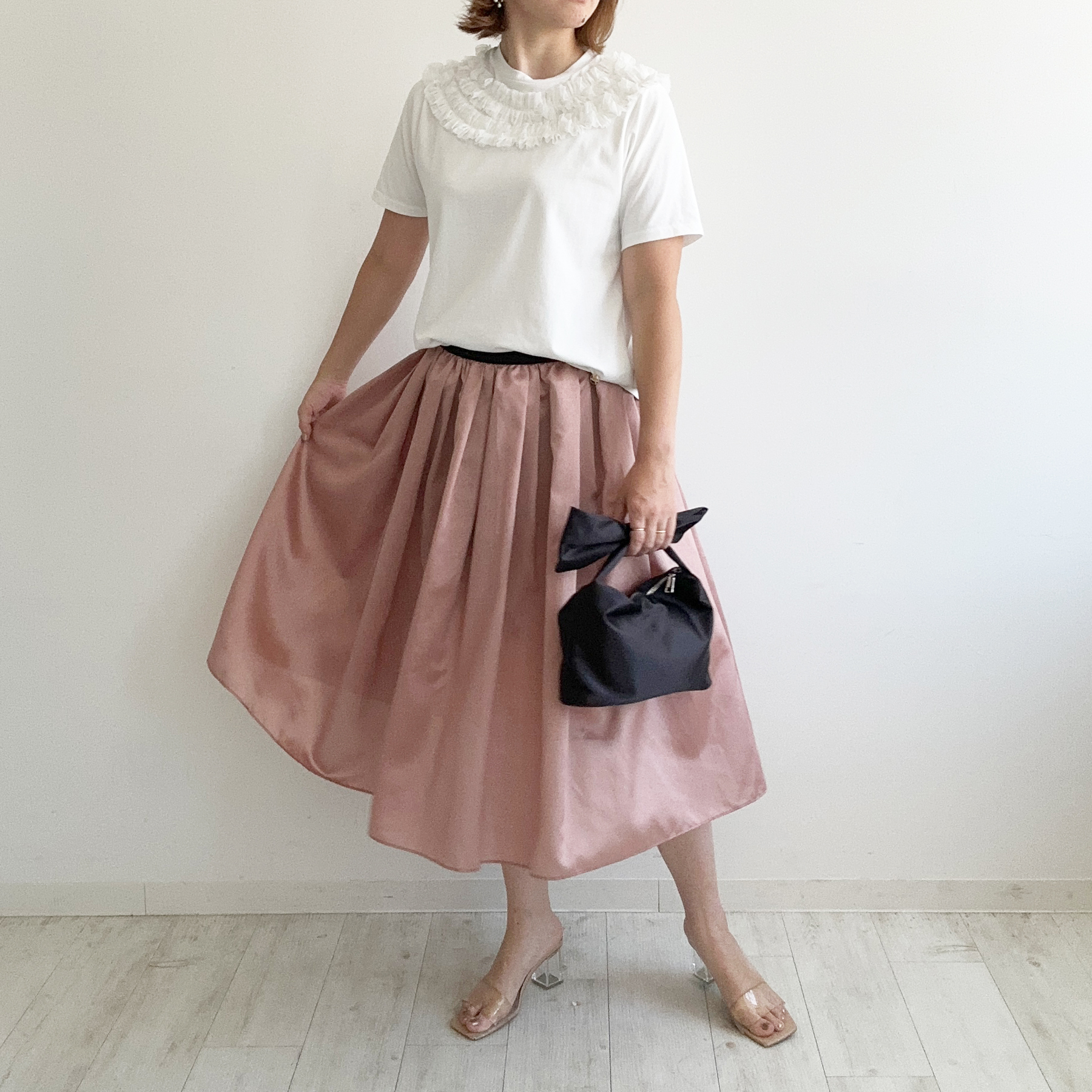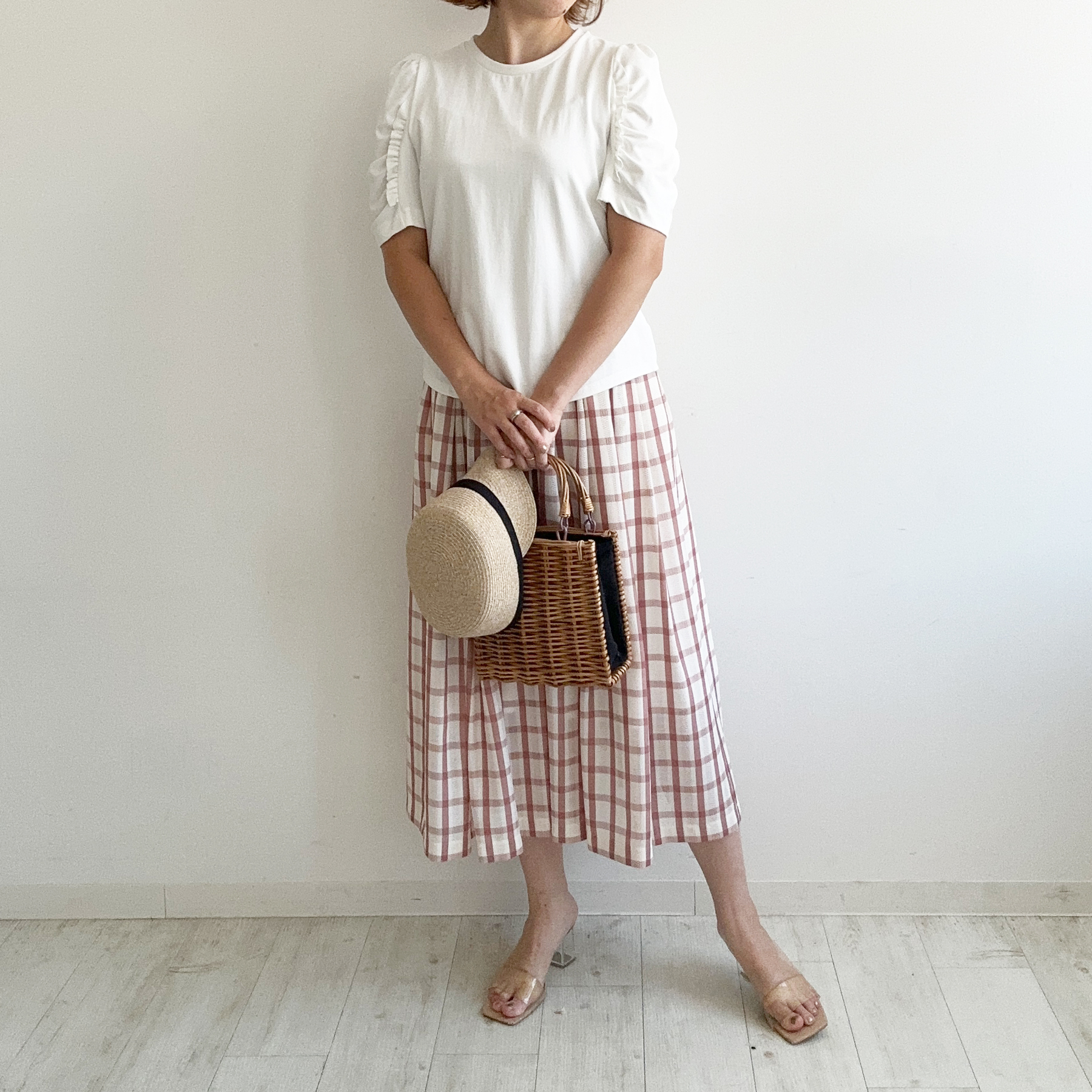 スカートには、程よいシアー感が涼し気なスカートを合わせて、夏らしく爽やかな印象に。