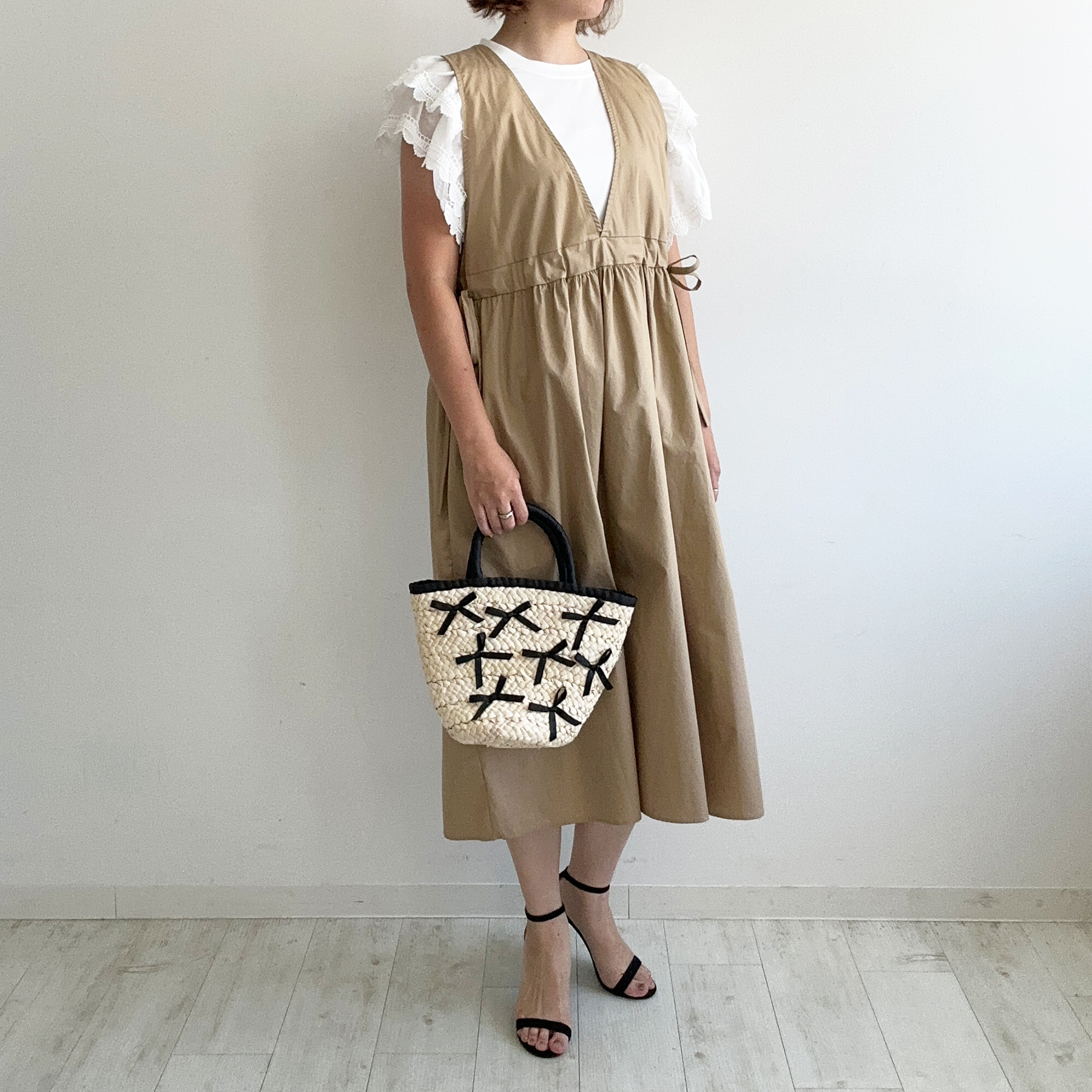 両サイドには、ウエスト調節が可能なリボンがあるので、シルエットに変化を付けれます。
