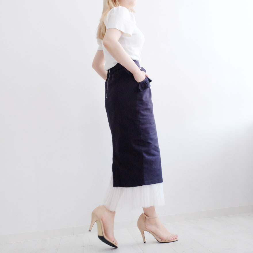 タイトシルエットでも伸縮性があり穿きやすく、膝下丈で大人っぽく合わせられます。
