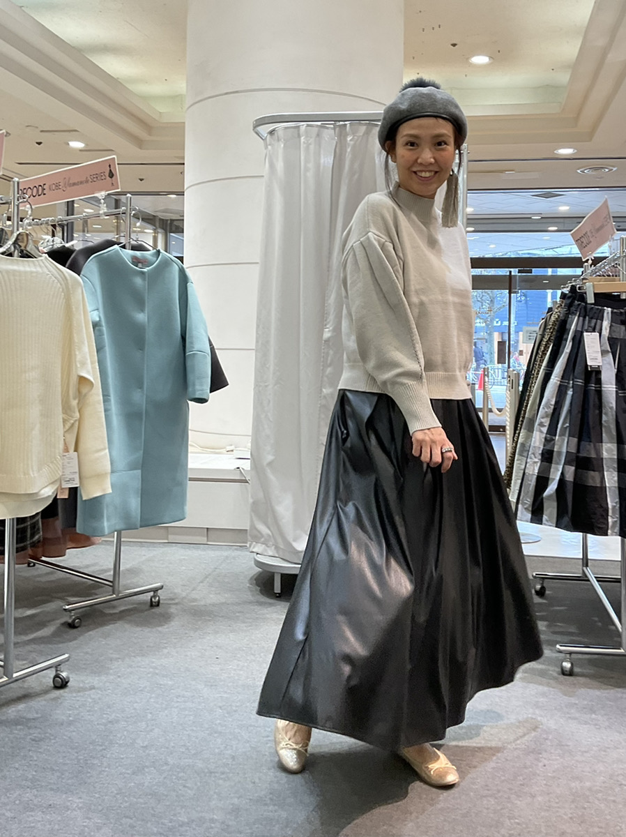 モードな雰囲気たっぷりのフェイクレザーアイテムを使っているのに、女性らしさが溢れているのは計算された”TRECODEのトップス”×”神戸・山の手スカート”だから!