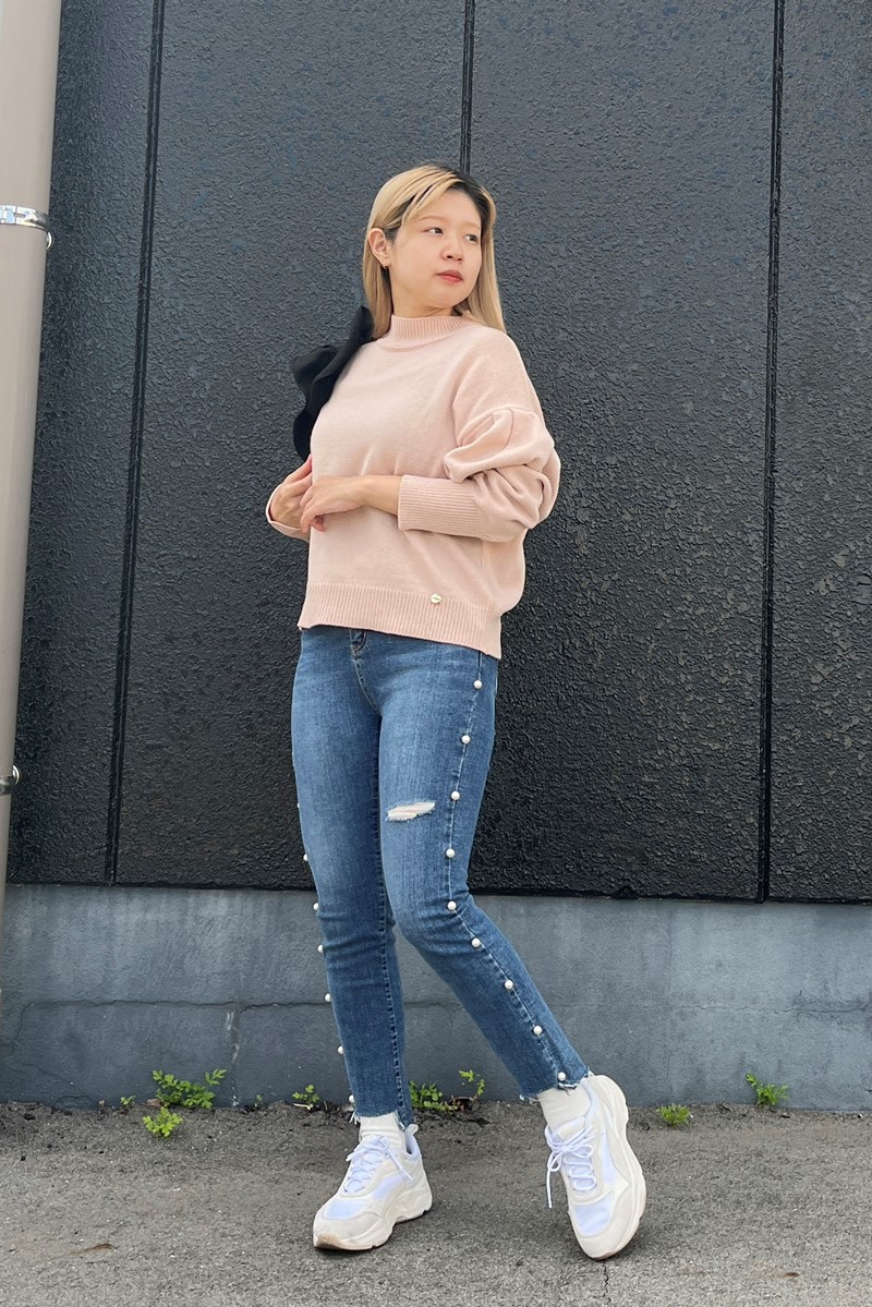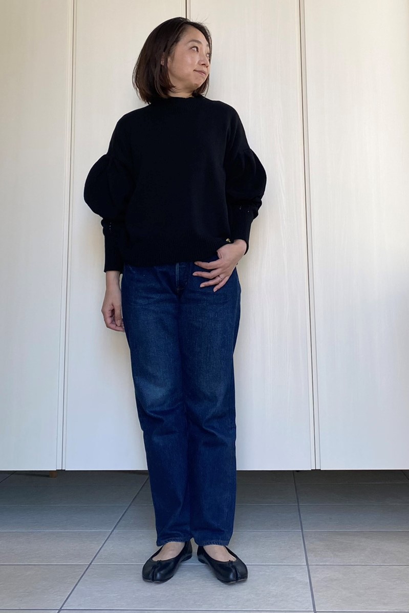 デニムのようなカジュアルアイテムと合わせてもニットのふんわりボリューム袖が女性らしさをプラス。