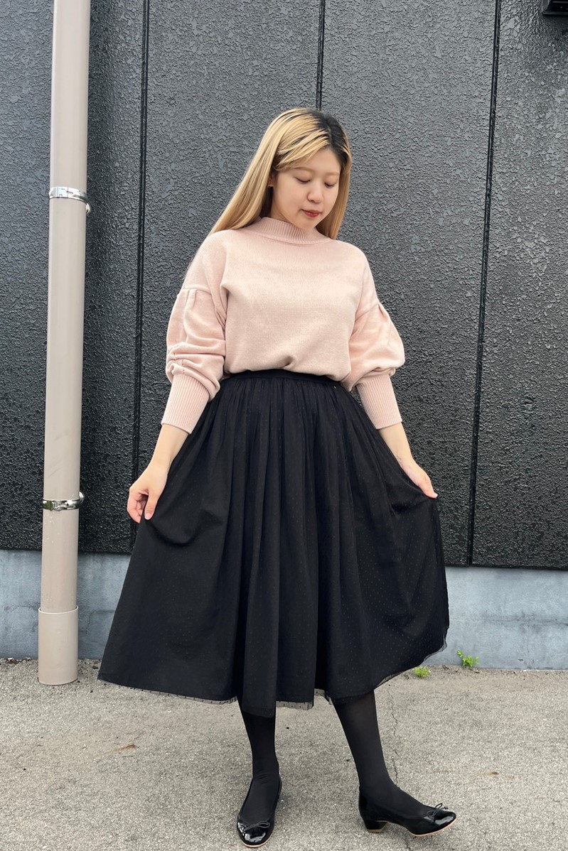 SKIRT左:神戸・山の手ドットチュールスカート ブラック ミモレ丈 ¥12,100(税込)