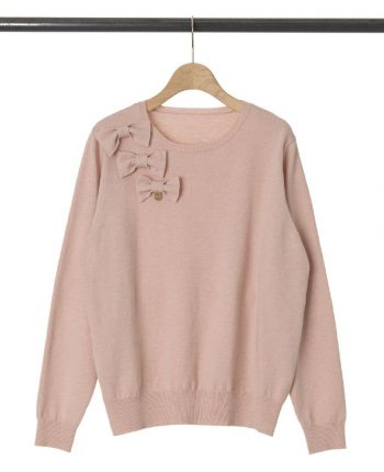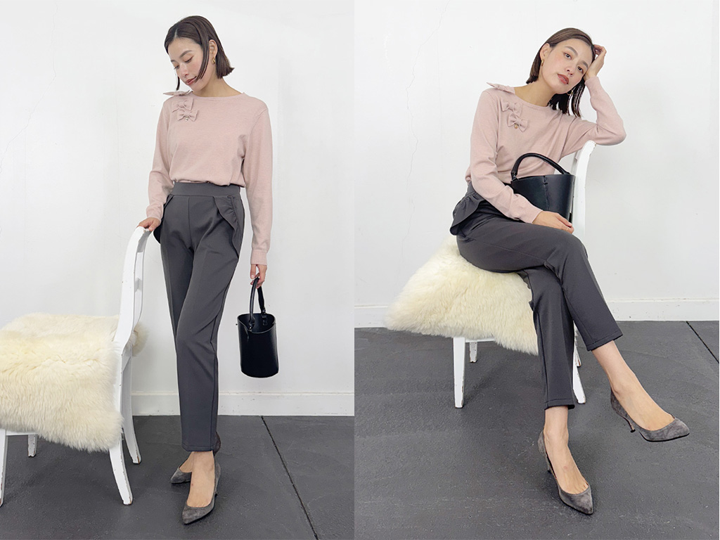 トップスのリボンニットは右肩から3連並んだリボンが目を惹くデザインですが、主張しすぎないのが丁度いい!