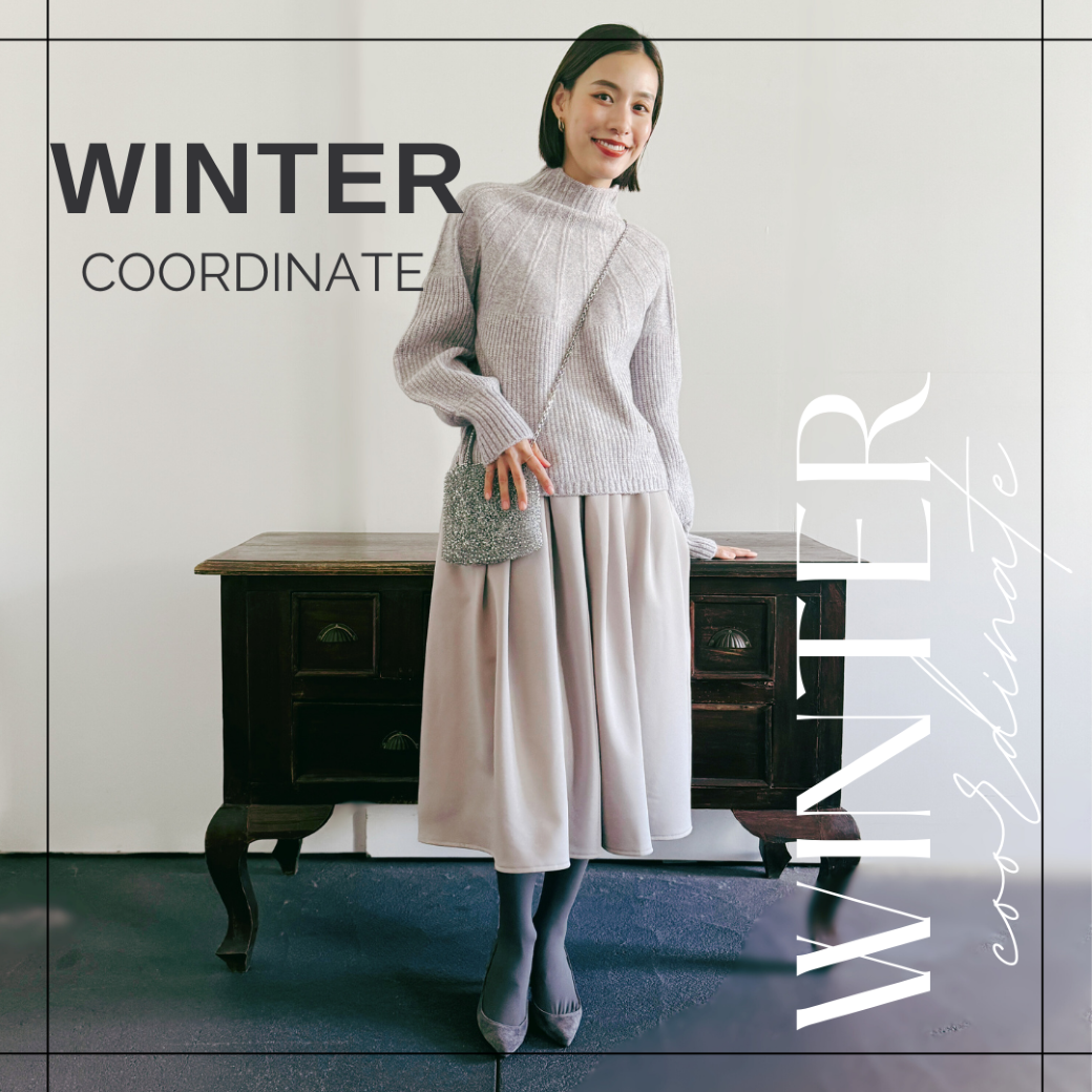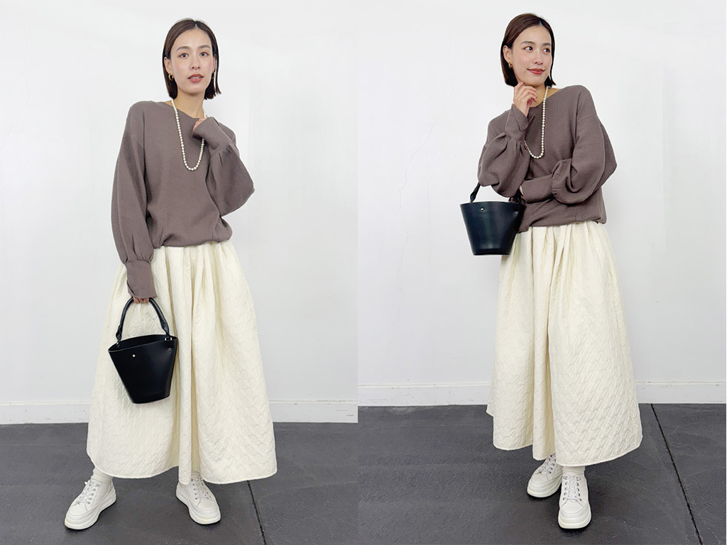 また、スカートは無地デザインなので素材に変化を付けて動きのあるスタイリングをすることでオシャレ見え♪