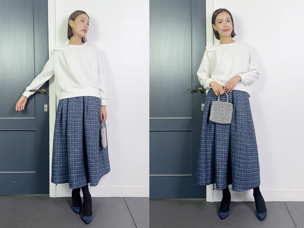 ツイードはカサっとした質感に見えがちなのでトップスは素材感を変えてツルッとしたダンボール生地がオススメ!