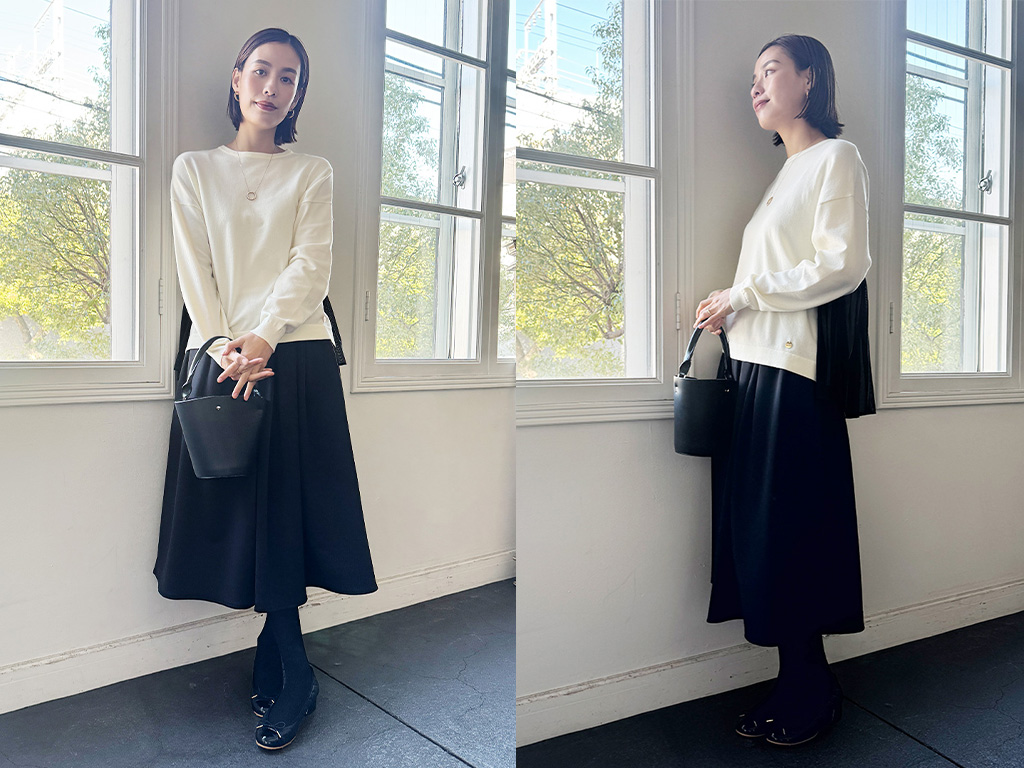 同じデザインでもブラックは洗練された都会的なイメージの着こなしで大人のフェミニンスタイルを◎