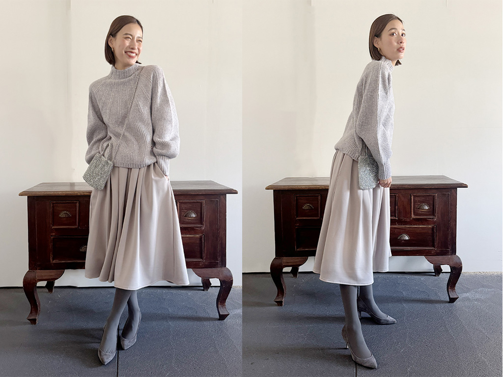 ボリューム感のあるニットトップスはボッテリ見えないようボトムはミモレ丈にし、