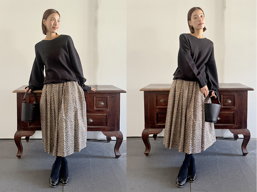 レオパード柄×ブラックの手番コーディネートは足元をラウンドトゥにするだけで可愛さがでます!