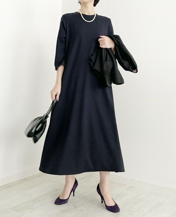 体の線を拾わないAラインシルエットで落ち感のあるデザインに。手首足首を見せてスッキリ魅せた大人のロングワンピースです。