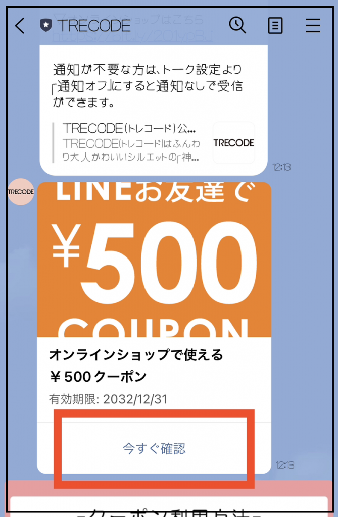 ①LINEの上記のようなクーポンプレゼントメッセージの場合は、【今すぐ確認】をクリック