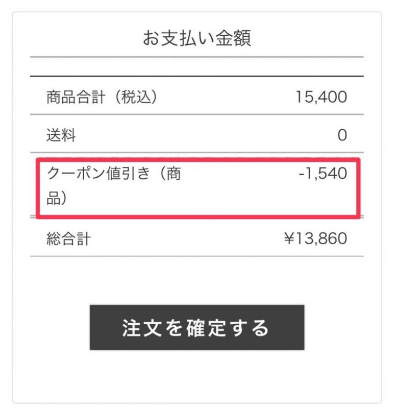 ⑥お支払い金額欄にてクーポン値引きがされているかを確認後、注文確定へお進みください。