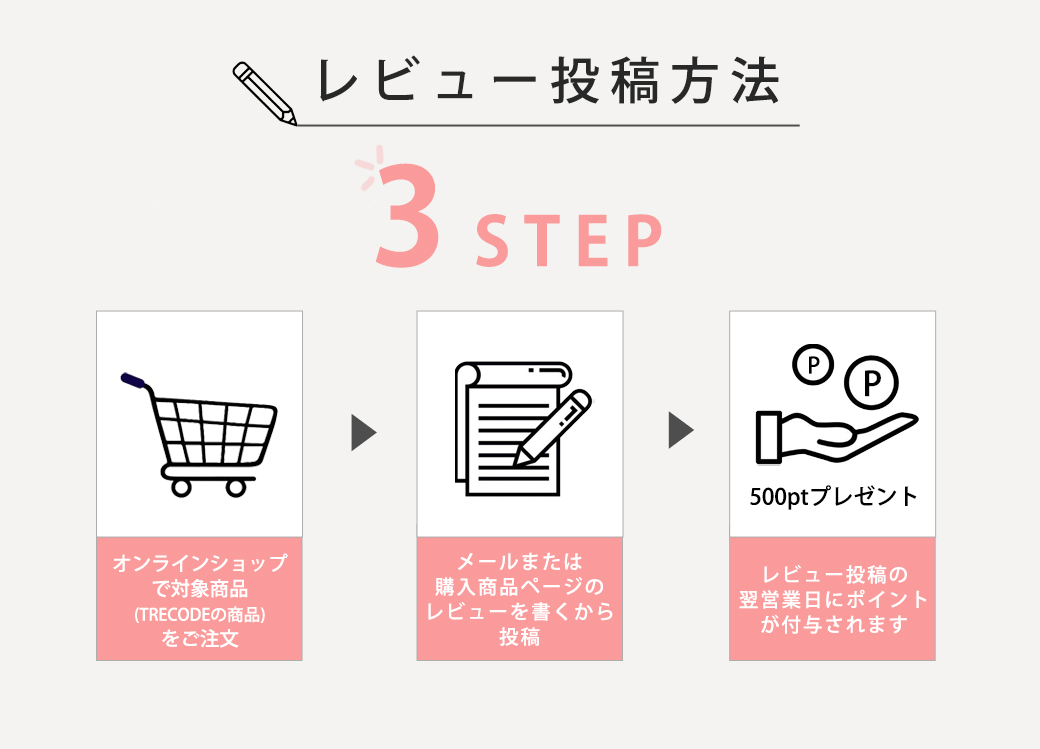 ・商品ページ経由でレビュー投稿された場合、ポイントはオンラインショップでの購入が確認でき次第、翌営業日に500ポイント付与いたします。