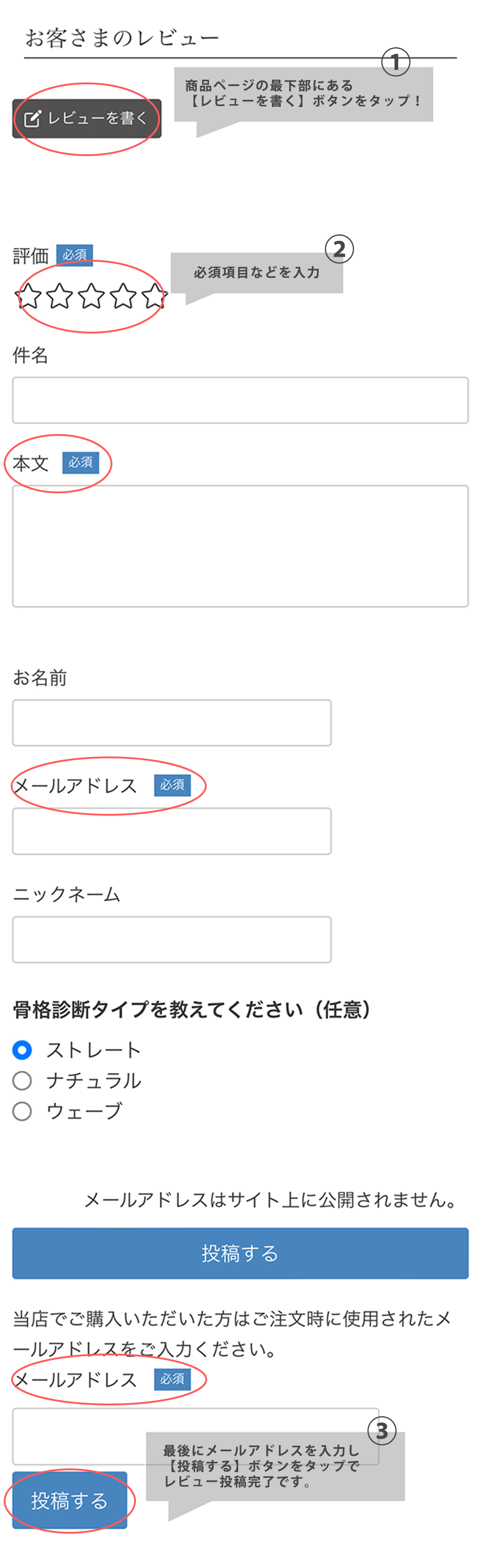 ③評価、本文、メールアドレスを入力、その他質問項目に回答して、「投稿する」ボタンをクリック