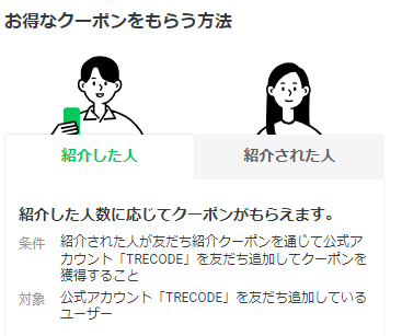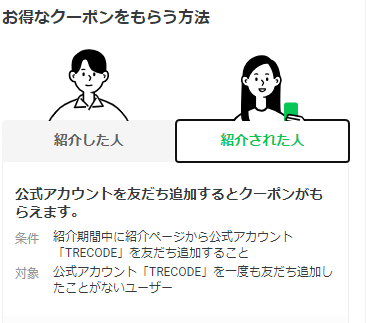 ・クーポンをほかのユーザーに紹介するには、公式アカウント「TRECODE」を友だち追加している必要があります。紹介した後に公式アカウントをブロックすると、クーポンを獲得できなくなります。