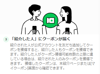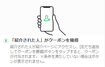 ・「紹介された人」が本クーポンを通じて対象の公式アカウントを友だち追加してクーポンを獲得すると、「紹介した人」にもクーポンが付与されます。